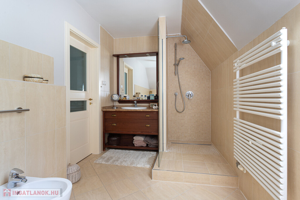 Emelet: három hálószoba (egy saját fürdőszobával), további fürdőszoba, két gardrób és közlekedő