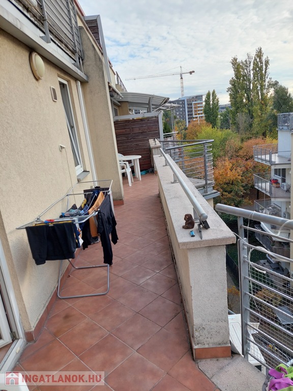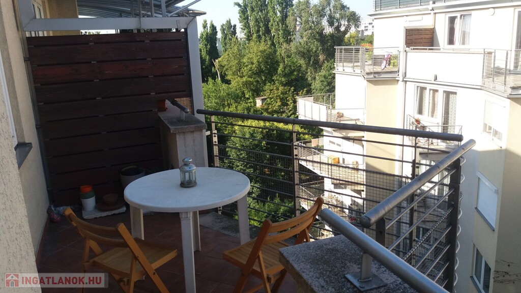 A lakás teljes hosszában futó nagy terasz igazi extra: grillezéshez, beszélgetésekhez és pihenéshez kiváló. A belső kertre néz, két napellenző gondoskodik a kellemes árnyékról.