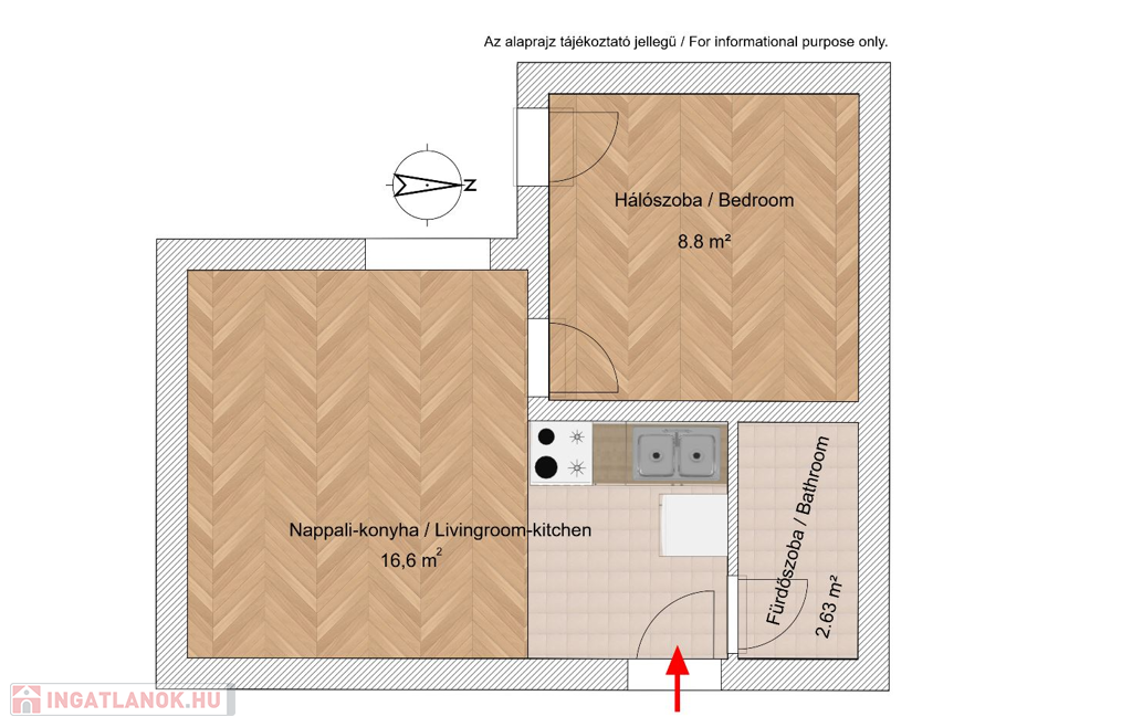 Előszoba + konyha-nappali kerámia burkolattal és laminált parkettával